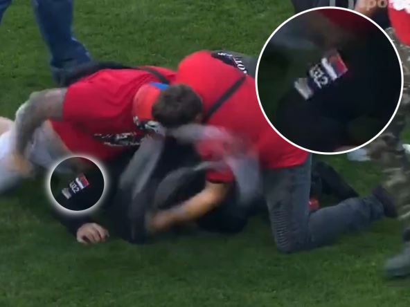 Obučen u duks sa srpskom zastavom na rukavu, navijač Sparte je oboren na teren i brutalno je prebijen pred kamerama. Dvojica su ga pesničili, a on je doslovno spasavao glavu. Pogledajte tu scenu:
