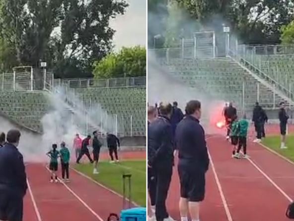 Reprezentacija Srbije prvi put je trenirala u Nemačkoj, na stadionu u Augsburgu, gde se dogodila jedna neprijatna scena. Pripadnici policije izveli su preko atletske staze jednog dečaka u dresu Crvene zvezde, a dok se to događalo, sa tribina je ka pripadnicima policije doletela baklja. Pogledajte tu scenu: