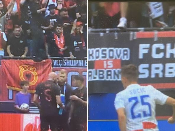 Nije to sve, ponovo su u centru pažnje bile i zastave na tribinama... Na jednoj od njih pisalo je "Sjedinjene albanske države", što pokazuje jasnu teritorijalnu pretenziju na zemlje u komšiluku, druga je bila posvećena terorističkoj organizaciji "UČK", odnosno OVK, a na trećoj je pisalo da je "Kosovo" albansko!