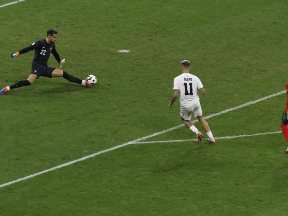 Izgubio je loptu Pepe, Benjamin Šeško je izašao u situaciju "jedan na jedan" sa golmanom Portugala Diogom Koštom, ali je čuvar mreže izašao u situaciji kao pobednik. Praktično rutinski je "skinuo" dosad najbolju šansu na utakmici!