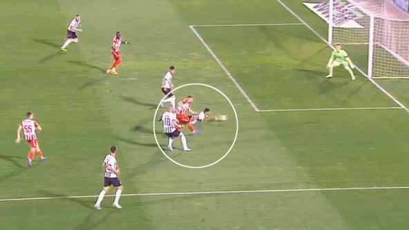 Ispostavilo se da je loptu zakačio svojom levom rukom, što isprva nije viđeno. Dosuđen je korner tokom kog je Novak Simović dobio poziv iz VAR sobe da je nešto sumnjivo, a potom je sam otišao da se uveri šta se desilo.