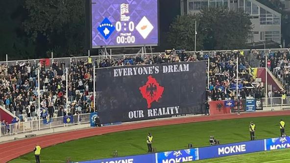 Na drugom transparentu koji je istaknut preko skoro cele tribine na početku utakmice bila je mapa tzv. Kosova u bojama zastave Albanije i sa crnim dvoglavnim orlom u sredini. Uz to je išao i natpis: "Svačiji san, naša realnost". Pogledajte kako je to izgledalo u Prištini: