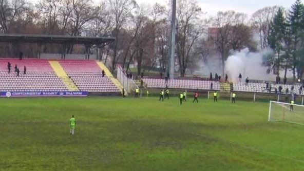 Na meču Prve lige Srbije između Borca i Smedereva u Čačku došlo je do sukoba navijača dva tima koji je srećom završen vrlo brzo, iako su se fudbaleri "odsekli" kada su videli dešavanja na tribinama.