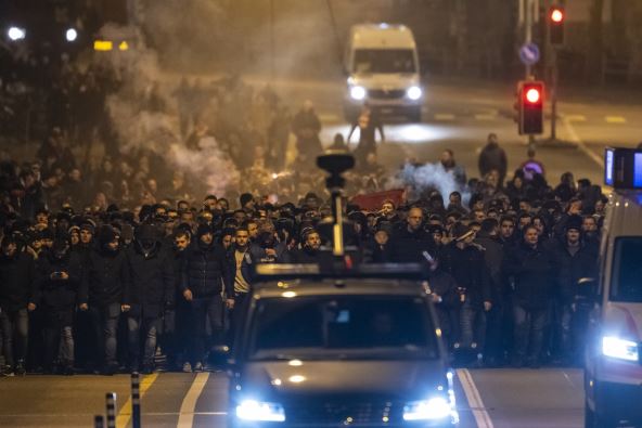 Navijači Crvene zvezde u velikoj grupi su došli iz centra Berna do stadiona Vankdorf, na kojem njihov tim od 21 čas igra protiv Jang Bojsa utakmicu Lige šampiona. Uz značajno prisustvo policije, oni su u koloni stigli na stadion, pogledajte: