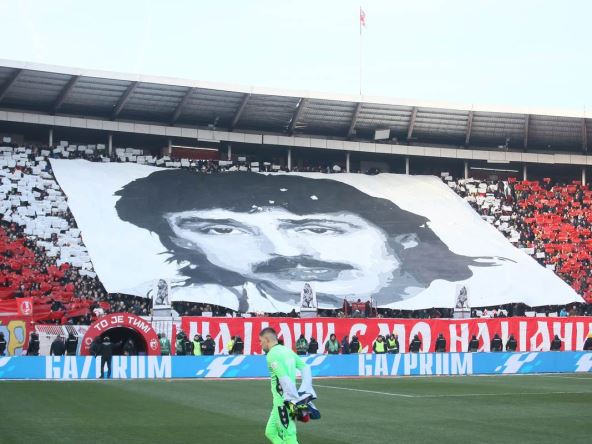 "Najjači smo najjači" pisalo je ispod šetalice sa likom Dragana Kojića Kebe i videlo se ime grupe "Delije Sever". Pogledajte kako je izgledala ova koreografija navijača Crvene zvezde koja je ukrasila stadion pred sam početak utakmice: