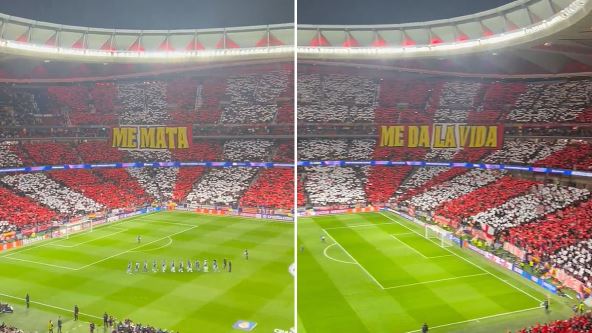 "Me mata" na jednom, a "Me da la vida" na drugoj strani krcatog stadiona "Vanda Metropolitano" u meču sa Real Madridom. Više od 70.000 navijča napunilo je ovo velelepno zdanje, a navijači Atletika su obojili tribine u crveno-belo na startu meča. Videla se i moćna poruka koja u prevodu znači "Ubija me, život mi daje!"