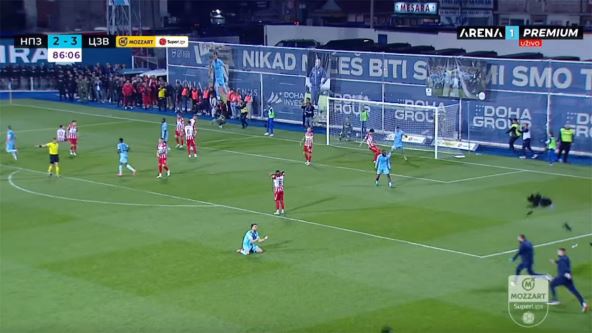 Jedan od najsikusnijih fudbalera tima iz Novog Pazara nakon prekida je sačekao loptu na drugoj stativi, namestio se kada je ona došla do njega i zatim raspalio ka golu Ivana Guteše. Mladi golman Crvene zvezde nije mogao ništa, šut je bio izuzetno precizan i lopta je nakon udara u prečku završila u mreži. Pogledajte kako je to bilo: