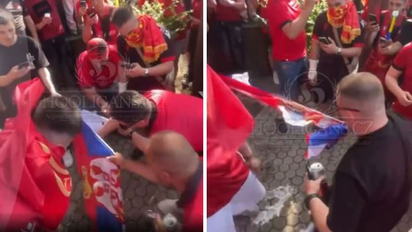 Na jednom od njih vidi se grupa navijača Albanije koja cepa zastavu Srbije uz pogrdno skandiranje. Takođe, podeljeni su i snimci na kojima se vidi kako se skandiraju parole poput "UČK" i slične neprihvatljive stvari, ispred stadiona su zastave Velike Albanije, tako da je jasno kakva atmsofera čeka naše fudbalere u Tirani.