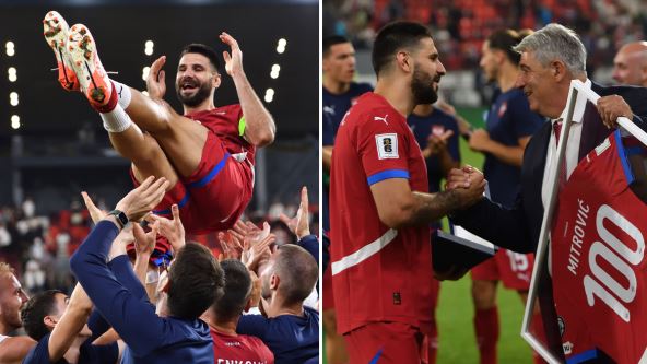 Direktor reprezentacije Srbije Stevan "Dika" Stojanović uručio je kapitenu nacionalnog tima Aleksandru Mitroviću uramljeni dres sa brojem "100" na leđima, u čast njegovog jubilarnog, stotog nastupa za "orlove". Ljubimac navijača potrudio se iz sve snage da ulepša taj meč tako što je postigao het-trik i poveo Srbiju ka Mundijalu 2026.