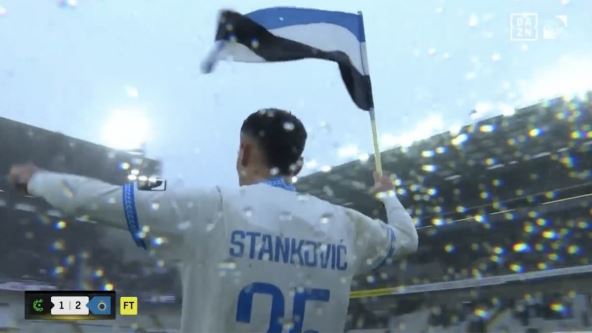 Aleksandar Stanković izazvao je delirijum na stadionu. Sa Klub Brižom je u derbiju savladao Serkl Briž (2:1) i onda je oduševio navijače. Uzeo je zastavu od njih, otišao do centra terena i zabo je baš tu. Podigao je ruke, proslavio trijumf sa njima i onda opet uzeo zastavu i krenuo da trči na terenu.