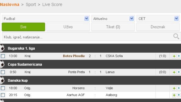 Opcija Livescore je otvorena kao posebna kategorija u meniju, a možete i pored svake sportske vesti da odete na rezultate uživo.