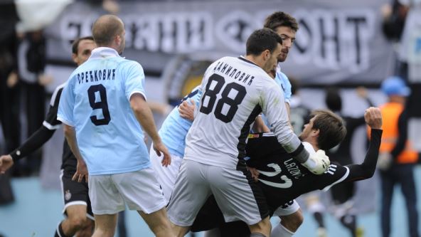 U 79. minutu, samo što je završeno slavlje igrača Rada, usledio je protiv napad Partizana, duga akcija završena je golom Darka Brašanca sa peterca, što je dovelo do - tuče! Dok je lopta ulazila u mrežu, u klinču su se našli Srđa Knežević i Danko Lazović, razmenili su nekoliko udaraca (možda bolje reći guranja rukom u lice), uključio se i golman domaćih Branislav Danilović i štoper Partizana Milan Obradović, utrčale su obe klupe na teren i - sreća - da se na tome završilo i da se ova kavga nije prenela i na tribine...
