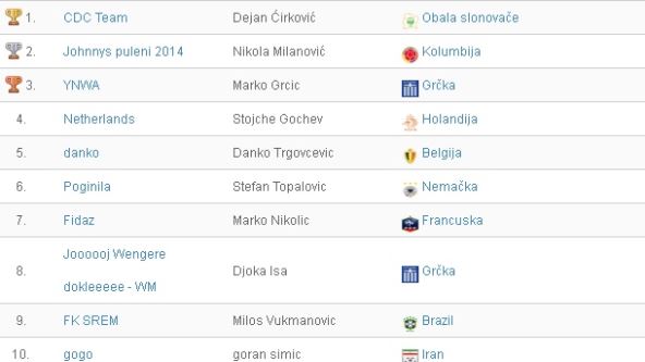 Pored njega, nagrade su dobili i drugoplasirani Nikola Milanović (Johnys puleni 2014 - nagrada adidas patike i torba za patike) i Marko Grcić (YNWA - nagrada adidas duks) i ovog puta im čestitamo, a svakoga od 10.716 registrovanih učesnika Mundijala pozivamo da i od avgusta učestvuju u Fantasy igrama na našem portalu.