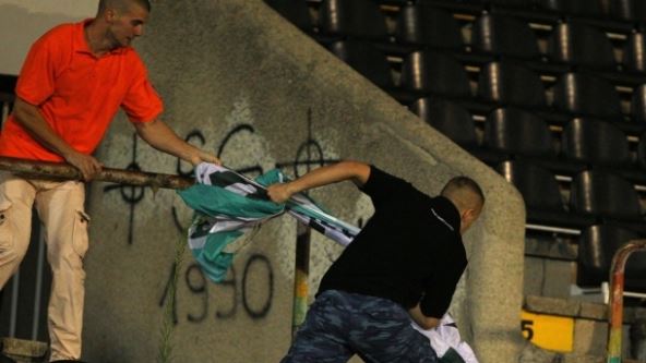 Nekoliko "Zabranjenih" krenulo je sa istočne tribine ka "kavezu" između severa i zapada u kojem su bili gosti iz Bugarske, sa ciljem da im poskidaju zastave zakačene na ogradu.