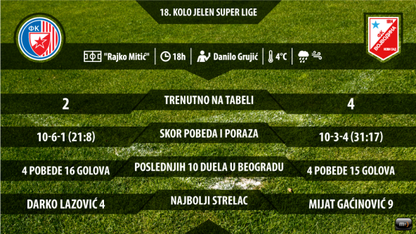 Ako Lalatović i Marić budu izveli ofanzivne timove koje su koristili u poslednje vreme, a najavili su da hoće, onda bi to trebao da bude meč spuštenih gardova na terenu najvećih dimenzija u državi, gde bi bilo sasvim dovoljno prostora za majstore s loptom, poput Darka Lazovića, Mijata Gaćinovića, Aleksandra Kataija ili Mirka Ivanića...