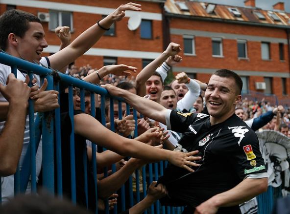 Brana Ilić deli radost sa Grobarima posle postignutog gola (tada je bilo 2:0). Foto: (MN Press)