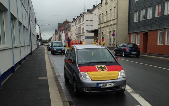 Najviše ih je na prozorima stanova, automobilima, kancelarijama, nalaze se gotovo u svakom izlogu radnji, bez obzira na delatnost, simboli Nemačke sa ponosom se nose na grudima, glavi, mogu se videti na biciklima, čak i na invalidskim kolicima, ali ima i onih maštovitih koji na poseban način iskazuju ljubav prema nacionalnom timu (poput gospođe koja je zastavicama ukrasila saksije sa cvećem na terasi, ili druge koja je trknula do prodavnice sa papilotnama u boji nemačke zastave)...