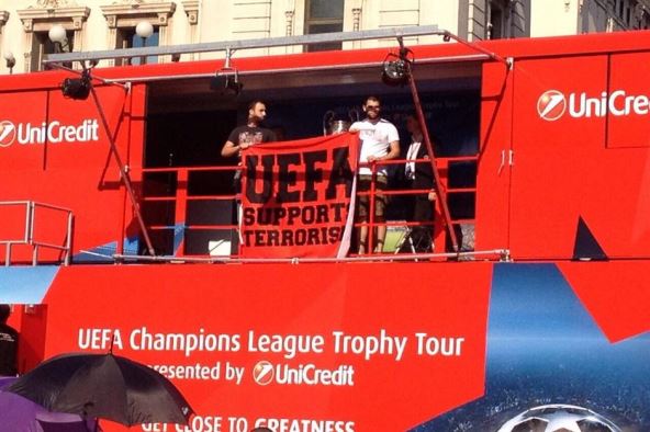 Dvojica navijača popela su se na binu i ispred pehara raširili mali transparent, sa porukom: "UEFA podržava terorizam", što se i vidi na fotografiji koju je MONDU poslao čitalac.
