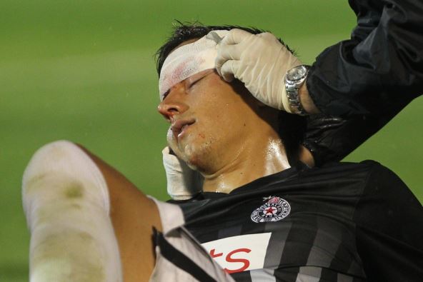 MONDU je u Partizanu potvrđeno da povreda koju je visoki vezista zadobio u 25. minutu utakmice sa lučanskom Mladosti u Humskoj nije nimalo naivna i da je Jevtović hitno morao da bude prevezen na Vojnomedicinsku akademiju. Tamo mu je rasekotina od 1,5 centimetra na licu ušivena s dve kopče.