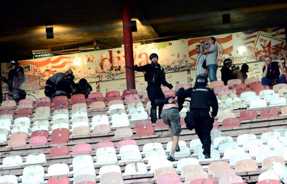 Grobari su ih prepoznali i onda je nastao haos. Navodno je jedan od huligana pokušao da iznese torbu u kojoj su bile zastave. Primećen je na izlazu i tu je došlo do prvog sukoba...