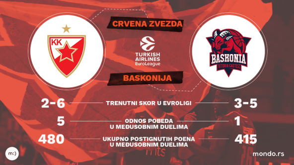 Crvena zvezda mts i Baskonija odigrali su šest međusobnih mečeva i srpski tim izgubio je samo jednom. Ipak, ovog novembra uloga favorita je na strani gostiju, koji u poslednje vreme igraju odlično, što i dokazuju uzastopnim pobedama u Evropi i u ACB ligi.