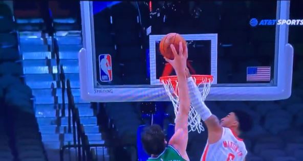Boban je u jednom trenutku krenuo na zakucavanje preko rukija Kenjona Martina Džuniora (20), ali ga je sin nekadašnjeg prvog "pika" NBA drafta atraktivno zaustavio na obruču.