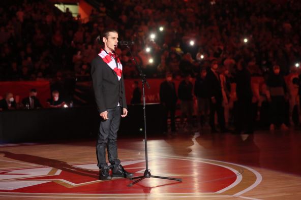 Umetnik iz Beograda je dočekao košarkaše Zvezde u hali na Novom Beogradu otpevavši himnu navijača crveno-belih "Dobro znaj", a čitava dvorana ga je najpre slušala, pa onda i pevala sa njim.