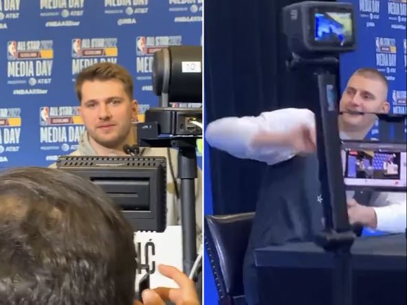 On je stigao na konferenciju neposredno posle Luke Dončića, a dok je slovenački plejmejker odgovarao na pitanja novinara Jokić se prišunjao i gađao ga lopticom! Pogodio je Dončića, a onda krenuo da se smeje i tražio je lopticu nazad!