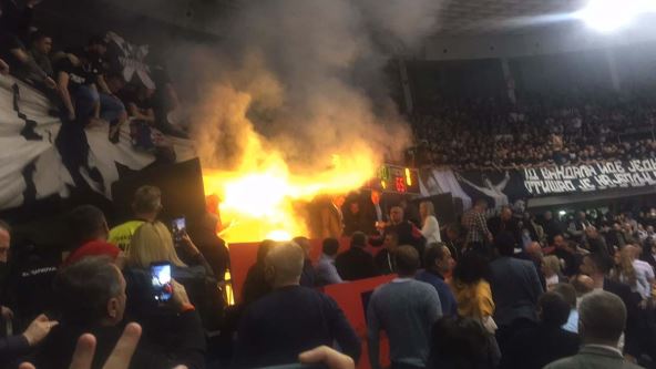 Sve je izazvala bačena baklja, zbog koje je buknuo plamen i morala je da bude evakuisana loža u kojoj je bio vrh KSS, kao i čelnici KK Partizan.