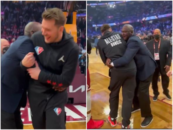 Izgleda da mu se najviše dopada Luka Dončić pošto je njemu prišao na parketu uoči početka Ol-star utakmice i zgrabio ga sa obe ruke, a čini se da je i košarkaš Dalasa ostao u čudu.