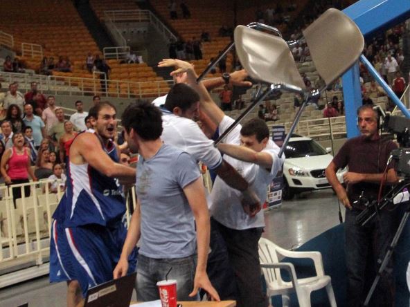 U velikom sukobu prštalo je na sve strane, sukobili su se Marko Kešelj i Kostas Carcaris, a kada je Teodosić završio na parketu, Krstić je prišao i počeo da udara najsnažnijeg igrača Grčke, Sofoklisa Skorcanitisa, posle čega su ga nekako udaljili van terena. Ipak, on nije mogao da se smiri, već je podigao stolicu i gađao Burusisa, koji nije nastupio u tom meču, ali jeste uleteo i agresivno išao ka Krstiću. Grk je krvavog lica napustio teren, a Srbin je morao u policiju, pa pred tužioca.