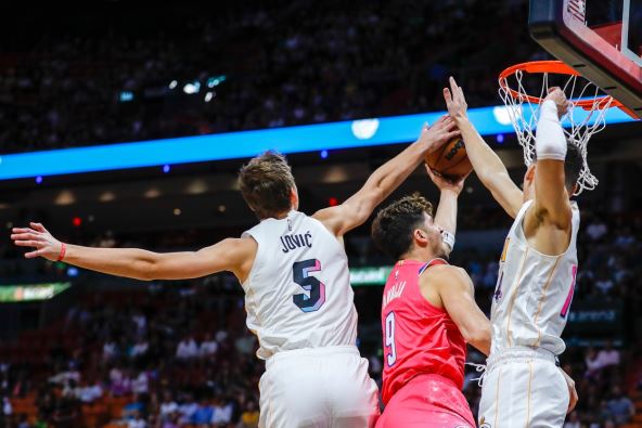 Majami je na svom terenu bio bolji od Vašingtona (110:107). Usled velikih problema sa povredama (nema Džimija Batlera, Viktora Oladiba, Dankana Robinsona i Maksa Štrausa), Erik Spolstra je poverenje ukazao upravo Joviću. Nikola mu je to vratio na pravi način u ulozi startera. Još uvek se navikava na društvo najboljih, a za 14 minuta na parketu imao je 7 poena i 1 skok. Najbolji u Hitu bio je Bem Adebajo (38, 12sk), a na drugoj strani su se istakli Bredli Bil i Kajl Kuzma sa po 25 poena, Deni Avdija je pored 8 poena imao 9 skokova i 5 asistencija.