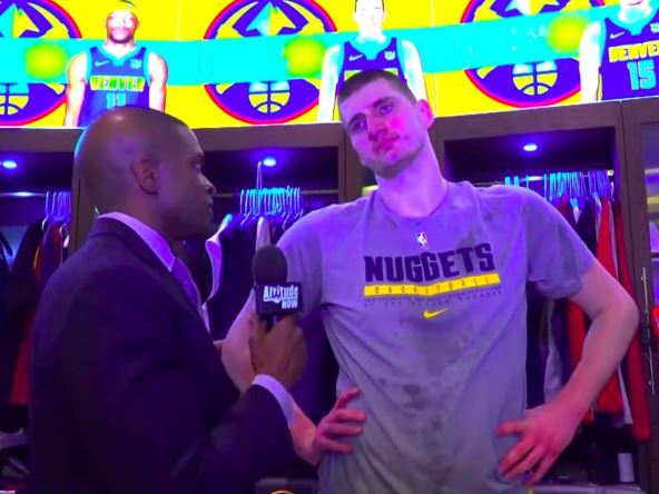 Na kraju je odvojio 80 sekundi da popriča sa reporterom Denvera, a njegov izraz lica sve govori. Jedva je čekao da se sve završi i da se opusti posle meča, verovatno u društvu svog saigrača Vlatka Čančara i "gosta u gradu" Luke Dončića. Obično, kada igrači sa Balkana gostuju jedni kod drugih organizuju večere u restoranu posle meča ili izlazak, pa deluje da se i Jokić tome više veselio nego intervjuu.