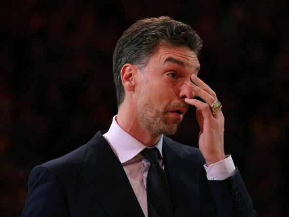 "Hvala vam puno, neverovatan osećaj. Hvala svima koji su ovde i hoću da vam kažem koliko mi ovo znači. Kada pogledam okolo srećan sam da vidim sve ove ljude ovde i bila mi je čast da nosim ovaj dres, da iram za ovaj tim, da se borim za ovaj grad", počeo je Gasol, a onda je pomenuo Kobija Brajanta! "Ali ne mogu da nastavim, a da ne govorim o nekome koga ovde ne vidim. O bratu koji me je podigao, inspirisao da budem bolji igrač i bolji čovek uopšte. Toliko mi nedostaje, kao i svima nama. Volim ga i voleo bih da je ovde. Volim te, brate!", rekao je emotivni Gasol, a sa tribina su se čuli povici Kobijevog imena!