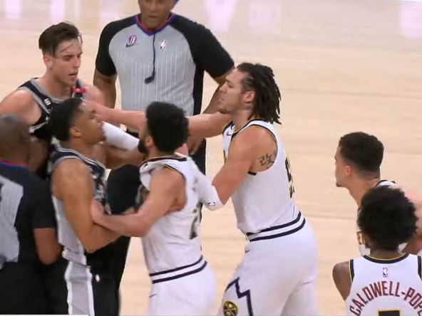 To se nimalo nije dopalo košarkašu San Antonija koji je želeo da odbrani čast, pa je odmah krenuo da se obračuna sa "provokatorom" Porterom. Stigao je do njega na polovini terena, malo su se gurali glavama, a onda su se očekivano uključili i ostali igrači San Antonija i Denvera nakon čega se situacija tek zakuvala, pa su sudije morale da razdvajaju košarkaše da ne bi došlo do opšteg haosa.