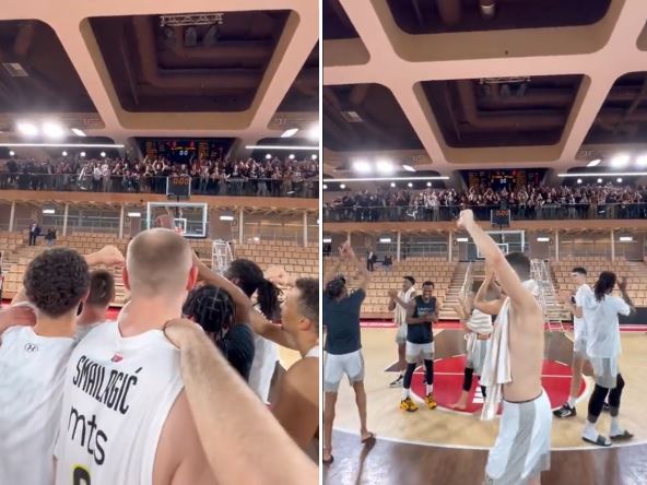 Polugoli, ogrnuti peškirima ili spremni za tuširanje, bosi ili u papučama, košarkaši Partizana su znali da moraju pred publiku. Sa tribine, tik ispod svodova dvorane u Monte Karlu, grmelo je "slavni klub, svima znan, beogradski Partizan", a svi igrači crno-beli pratili su ritam koji su zadavali njihovi navijači. Zvanični Tviter profil Partizana pokazao je kako je to izgledalo.