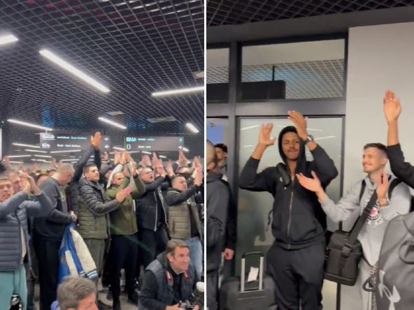 Pogledajte i snimke sa aerodroma koje je objavio Partizan na svom Tviter profilu, a na kojima se vidi da su u igrači crno-belih imali širok osmeh na licu kada se začula pesma njihovih miljenika, dok se još glasnija očekuje u utorak kada će ugostiti Real Madrid u Areni, s tim da je Malkolm Dilejni izrazio brigu da veruje da će "kraljevski klub" sve učiniti da se utakmica igra iza zatvorenih vrata.