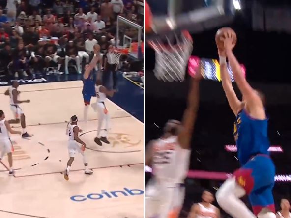 Iako su ih mnogi otpisali pred ovu seriju - igrači Denvera su bili na visini zadatka. Pogledajte samo akciju u kojoj Džamal Marej dodaje u stilu srpskog košarkaša, a zatim Nikola Jokić "leti" i preko Durenta. Jedan od najboljih igrača lige nije mogao na vreme da stigne i postavi se za blokadu, pa je na kraju samo ostao na posteru. Ovako je to bilo: