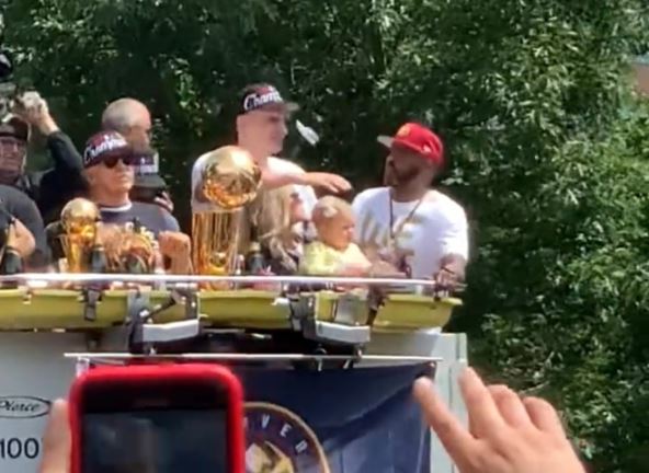Tokom proslave titule, i Nikola Jokić pogođen je u glavu kao i njegova supruga Natalija. Nakon što su nju pogodili limenkom, najboljeg košarkaša sveta pogodili su nečim što podseća na flašicu. Pogledajte: