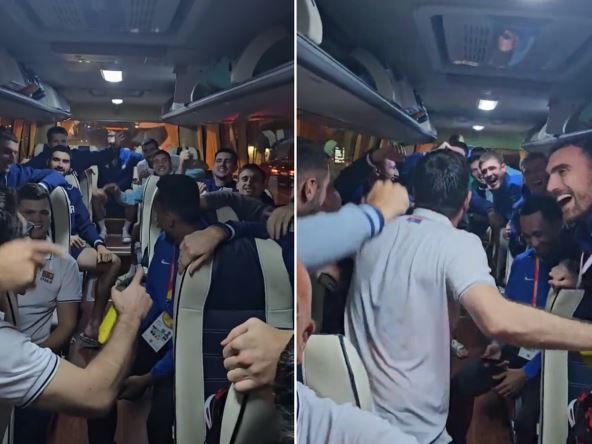 Posle velike pobede usledilo je slavlje, pa su selektoru pevali popularnu navijačku pesmu "Feed from desire", koja se pretežno koristi u fudbalu ali sada imamo priliku da vidimo kako su "orlovi" slavili uz ovaj hit. Ceo autobus glasno je pevao "Kari's on fire, your defence is terrified", prepevanu verziju pesme.