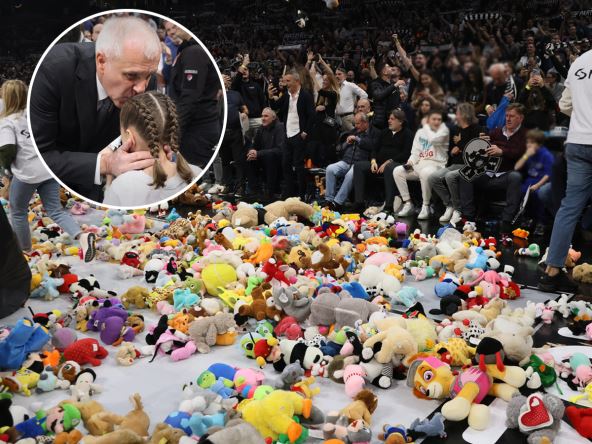 Partizanova utakmica u Evroligi nikad nije kasnila zbog ispravnijeg i humanijeg razloga. Lutke su pre prvog podbacivanja lopte na utakmici postavljene na sto iza klupe Partizana. Pogledajte tu lepu scenu pred meč: