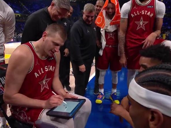 Sada se konačno i pojavio snimak na kome se vidi kako je Jokić "preuzeo trenersku palicu" Krisa Finča i održao govor svojim saigračima koji je izazvao salve smeha. Šta je Jokić uradio? Maksimalno ozbiljno je shvatio svoj poziv i na tabletu je nacrtao akciju koju su igrači Zapada "morali" da izvedu u sledećem napadu, bez Luke koga je ostavio na klupi. Pogledajte:
