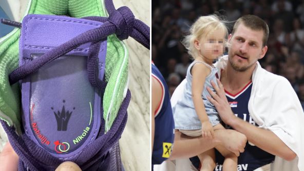U pitanju su patike koje su u ljubičastoj boji sa zelenim detaljima (s jasnom asocijacijom na Džokera, što je i njegov nadimak), a koje na "jeziku" imaju napisana njihova imena. I ne samo to, u pitanju je posebno dizajniran "džep" u koji Jokić sada može da ubaci burmu, umesto da je zaveže za pertle kako je to inače radio od kada se oženio. Pogledajte kako izgledaju specijalne patike Nikole Jokića:
