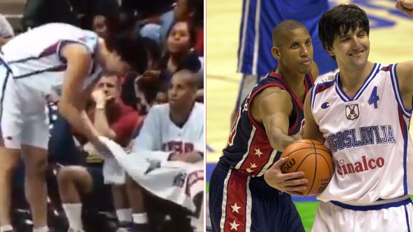 Mnogi taj meč pamte po majstorijama Milana Gurovića, drugi pak po sjajnoj partiji Vlada Divca i Peđe Stojakovića, dok je sigurno dobrom delu navijača košarkaške reprezentacije ostala u pamćenju i scena Dejana Bodiroge i Redžija Milera. Kapiten našeg tima prišao je NBA zvezdi i obrisao je ruke o njegov peškir. Pogledajte kako je to izgledalo.