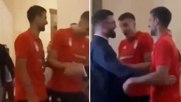 U želji da se pozdravi sa Novakom, Crnogorčević je stao ispred njega i Bogdana Bogdanovića, a košarkaš ga nije uočio, pa je slučajno glavom udario u tvorca stihova "Veseli se srpski rode". Naravno, taj trenutak nijie uticao na sjajno raspoloženje, koje je eruptiralo kada su se ti stihovi zapevali iz grla sportista i desetina hiljada navijača.