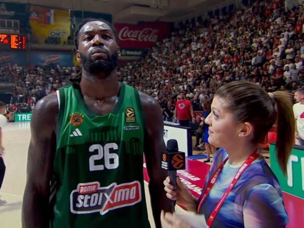 Crvena zvezda posle prvog poluvremena vodi protiv Panatinaikosa u Pioniru (46:38). Posle prvih 20 minuta dvojica igrača dali su izjave za Evroligu i izneli svoja očekivanja, bili su to ovog puta Ajzea Kenan i Matijas Lesor. Posle košarkaša crveno-belih na red je došao centar grčkog tima.