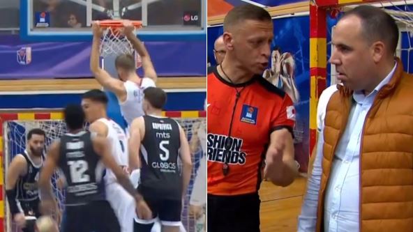 "Krivac" za prekid bio je centar Barana Lovro Buljević koji je snažnim zakucavanjem ne samo zatresao konstrukciju koša nego je i potpuno pomerio i srušio! Videlo se dok se još držao za obruč u 28. minutu meča da je konstrukcija popustila i otišla u jednu stranu, a na kraju su sudije morale da prekinu utakmicu.