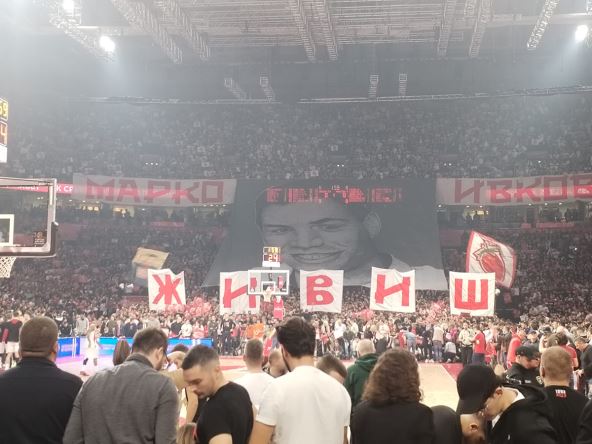 Navijači KK Crvena zvezda istakli su koreografiju preko čitave dvorane Beogradska arena u znak sećanja na ubijenog Marka Ivkovića - Jagodu. On je bio navijač Zvezde koji je pre 10 godina ubijen u Istanbulu, u napadu navijača Galatasaraja ispred dvorane, na utakmici Evrolige.