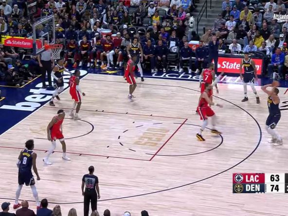 Jedna trojka Nikole Jokića bila je posebno važna - pogodio je nakon što su Klipersi loše izoritirali u odbrani, a hrvatski centar Ivica Zubac zakasnio da izađe na šut i oteža mu posao. Jokić je pogodio u lice centru tima iz Los anđelesa, a to je znao da proslavi i američki komentator.