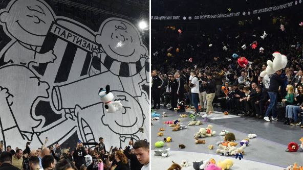Navijači Partizana napravili su sjajan gest pred početak utakmice Partizan - Makabi. Nakon što je na tribini razvijena velika koreografija Grobara sa simbolima dece, sa tribina su na parket poletele plišane igračke.